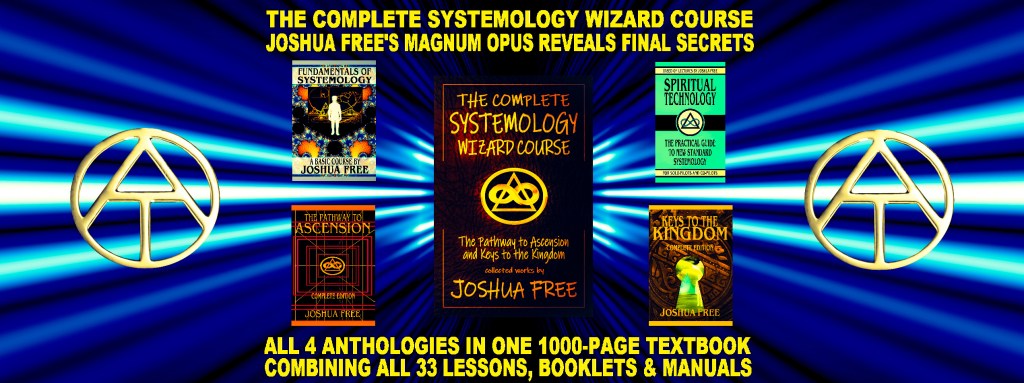 THE COMPLETE SYSTEMOLOGY WIZARD COURSE by Joshua Free [Available from AMAZON, B&N, BAM, or upon request wherever books are sold.] This oversized textbook anthology contains a complete collection of materials from all 33 lesson-manuals developed for “New Standard Systemology,” including: the “Fundamentals of Systemology” (Basic Course), the “Pathway to Ascension” (Professional Course), and the “Keys to the Kingdom” (Advanced Training Course), in addition to the “Spiritual Technology” course supplements—all in one volume for the very first time.